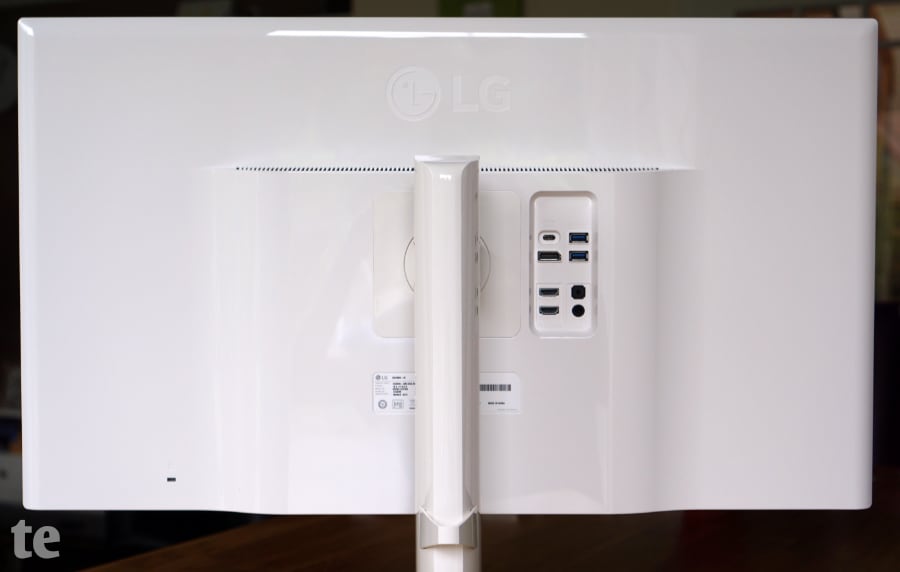 Der silberfarbene geschwungene ArcLine-Monitor-Fuß macht einen filigranen Eindruck, sorgt aber für eine erstaunlich gute Standfestigkeit des großen LG-Displays. Die Rückseite des UHD-Monitors ist in schlichtem weiß gehalten. Das sieht nicht nur gut aus, sondern hat gegenüber den üblichen schwarzen Bildschirmen den entscheidenden Vorteil, dass die Rückseite kaum anfällig für Staub und Fingerabdrücke ist.